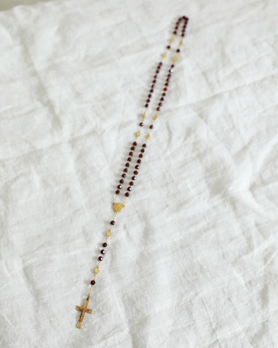ボルドーカラーの多角形のビーズにゴールドのチェーンや