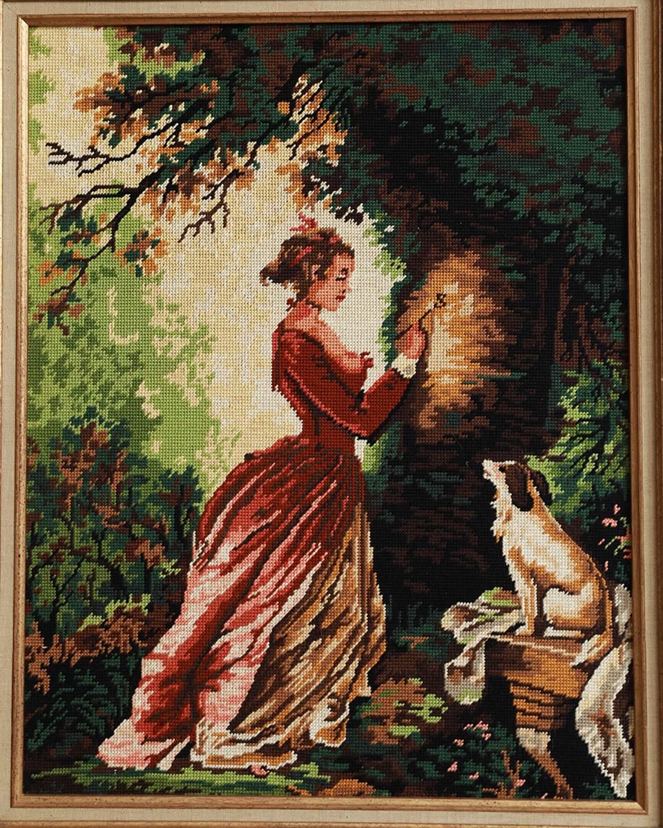 美しい女性と上品な犬の姿が刺繍によって描かれた