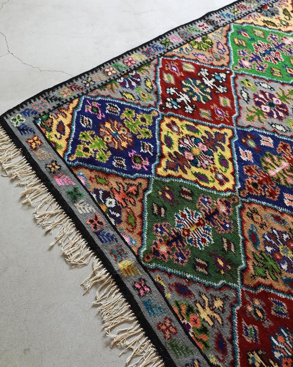 色鮮やかなデザインが魅力的なアンティークラグです。
