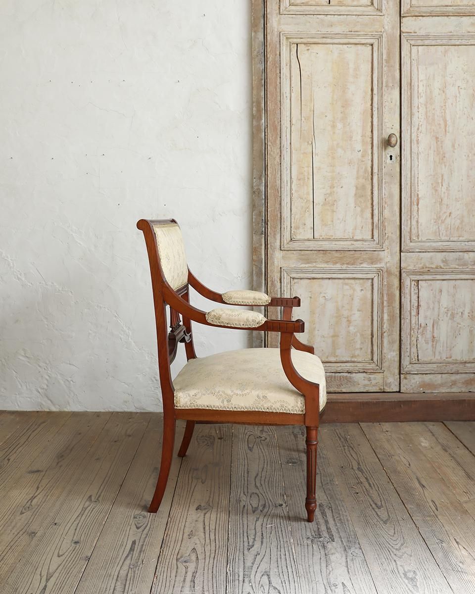 フランスより届いた気品だ高く高貴な佇まいのファブリックアームチェア。