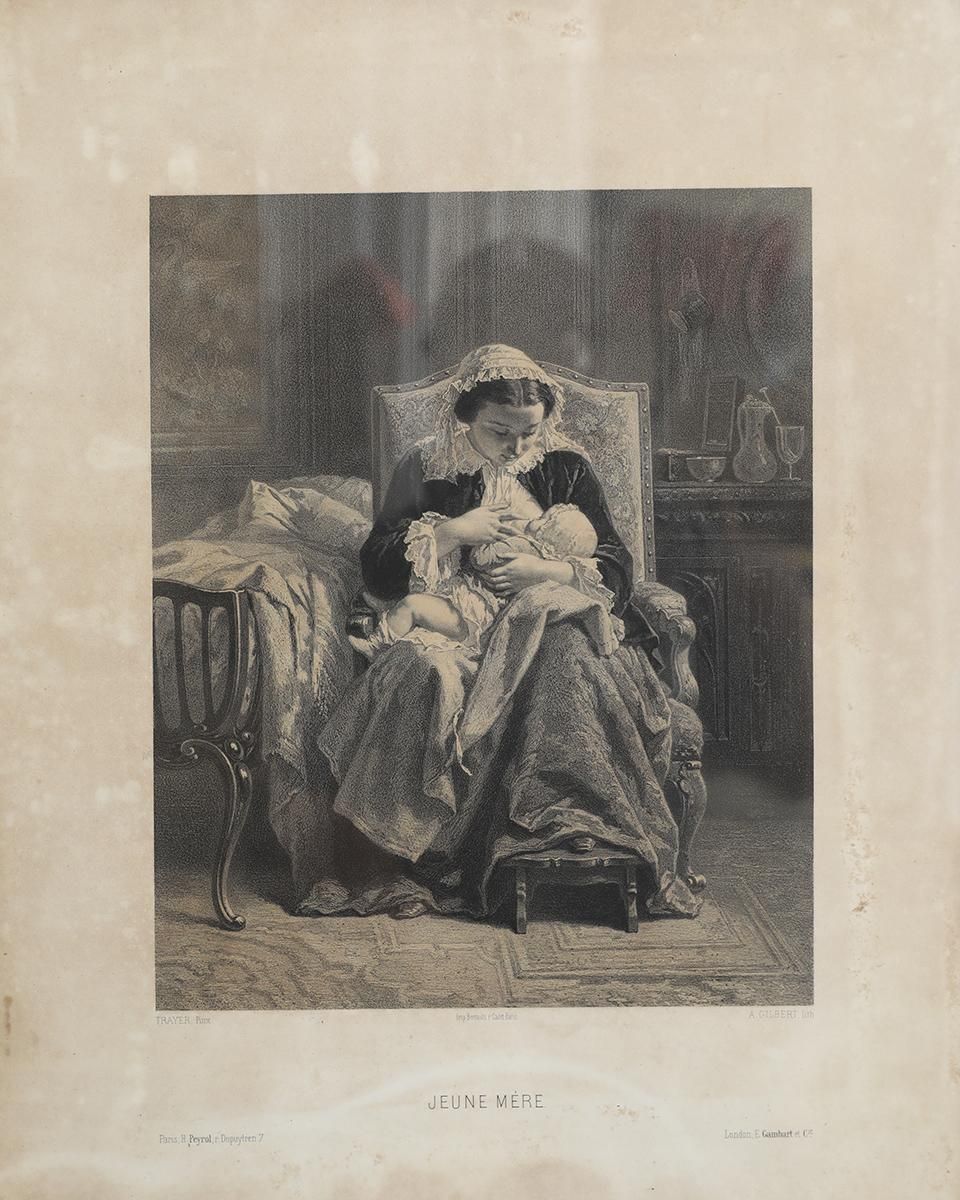 若い母親が乳児にミルクを与える姿が描かれたリトグラフです。