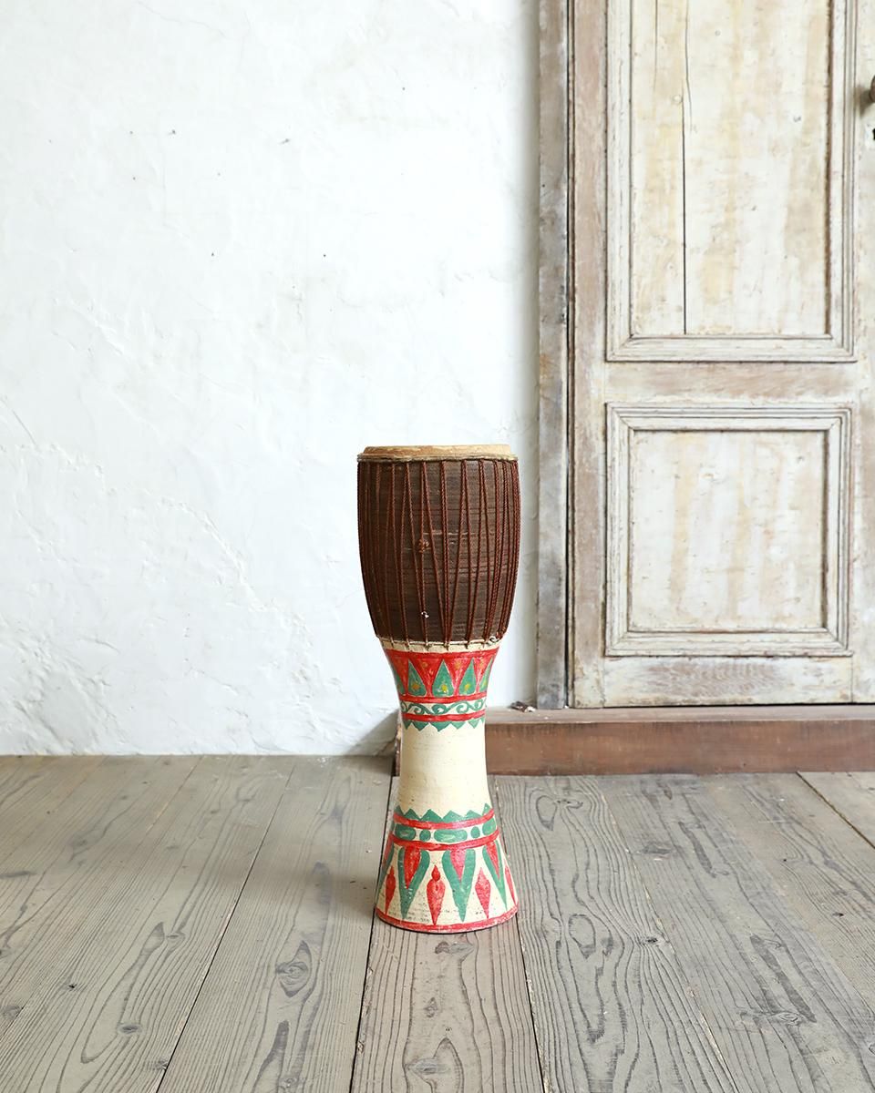 フランスで買い付けたカラフルな模様が目を惹くジャンベ(民族楽器)です。