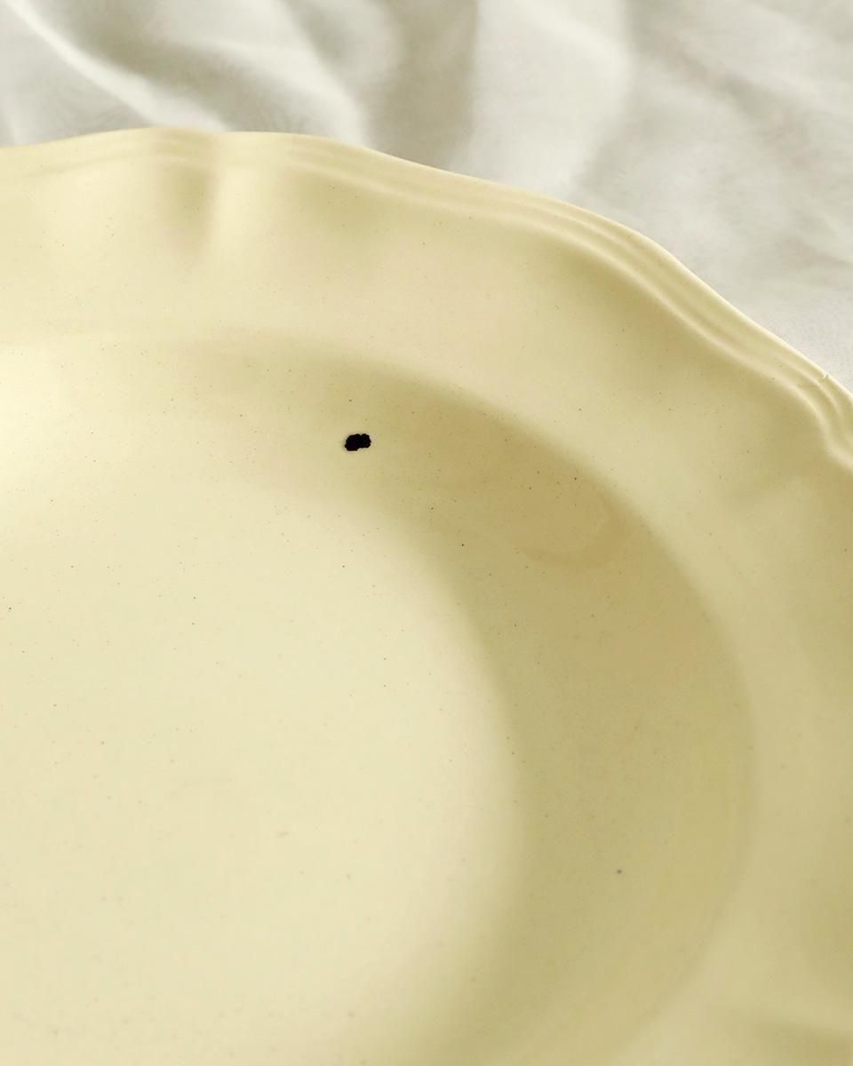 釉ムラや色移り、カトラリー跡や縁に小さなチップなどが