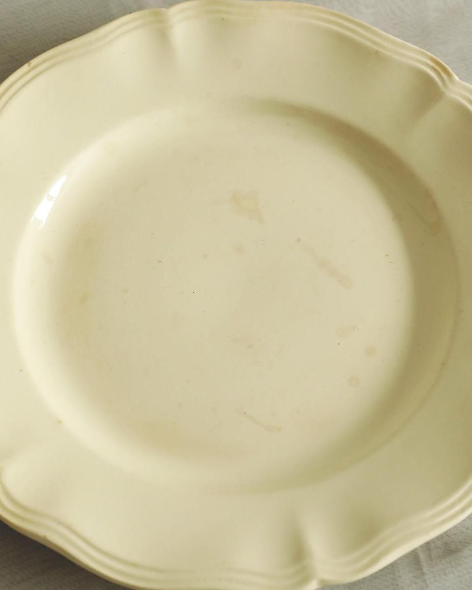 釉ムラや色移り、カトラリー跡や縁に小さなチップなどが